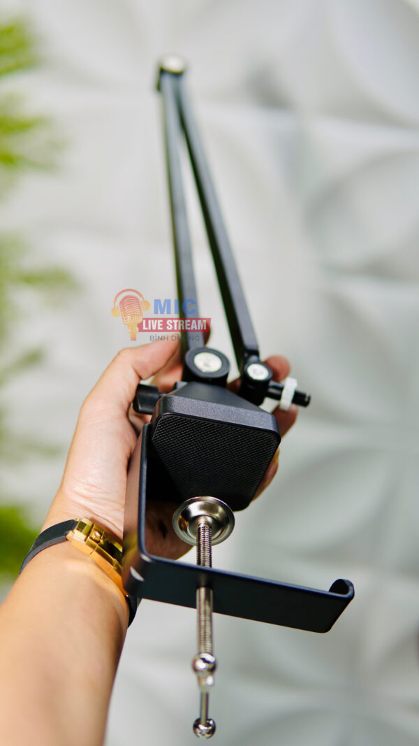 Về kích thước, thân kẹp có chiều dài lên đến 35cm, giúp mở rộng phạm vi sử dụng và dễ dàng điều chỉnh theo nhiều không gian làm việc khác nhau. Phần giá đỡ kẹp rộng 6.5cm, đảm bảo khả năng bám chắc vào mặt bàn hoặc các bề mặt cố định, giúp giữ micro ổn định trong suốt quá trình sử dụng.